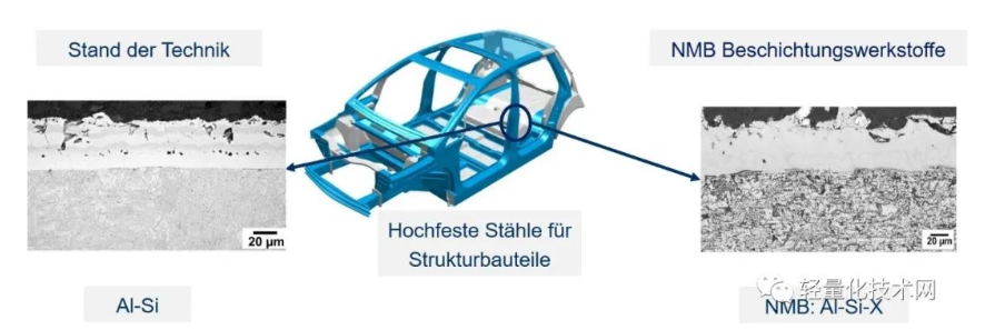 MatKoP项目开发的材料基于对 Al-Si-X 材料的改性,通过改性,高强度金属板的热保护性能和机械保护性能在成型过程中和成品部件中都得到了改善。项目的另一项成果是在涂层材料和涂层工艺方面大大降低了成本。涂有所开发材料的钢板通过热板材成型并成功进行了测试。与现有技术相比,新型保护涂层的开裂现象较少。