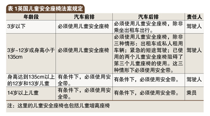 台湾地区2003年法律规定4岁以下儿童乘车时必须使用安全座椅,2012年进一步要求4~12岁儿童乘车也必须使用儿童安全座椅。英国法律开始要求“有条件下,鼓励3~11岁儿童使用儿童安全座椅”,2006年颁布的新法律要求0~12岁或身高