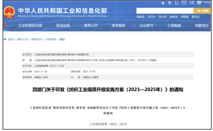 工业和信息化部、国家发展改革委、商务部、市场监管总局等四部门近日联合印发《纺织工业提质升级实施方案(2023—2025年)》,提出到2025年,我国现代化纺织产业体系建设取得实质进展,规模以上纺织企业营业收入稳中有增,发展质量效益保持良好水平,纺织工业国际优势地位进一步巩固提升。创新能力不断增强,规模以上纺织企业研发经费投入强度达到1.3%。智能制造加快推进,70%的规模以上纺织企业基本实现数字化网络化。产业结构更加优化,高性能纤维、高端纺织装备、战略性产业用纺织品自给率基本满足需求。品牌建设深入推进,形成20家全球知名的企业品牌和区域品牌,时尚引领力进一步提升。绿色低碳循环发展体系得到健全,单位工业增加值能源、水资源消耗进一步降低,主要污染物排放强度持续降低,废旧纺织品循环利用质量和规模不断提高。