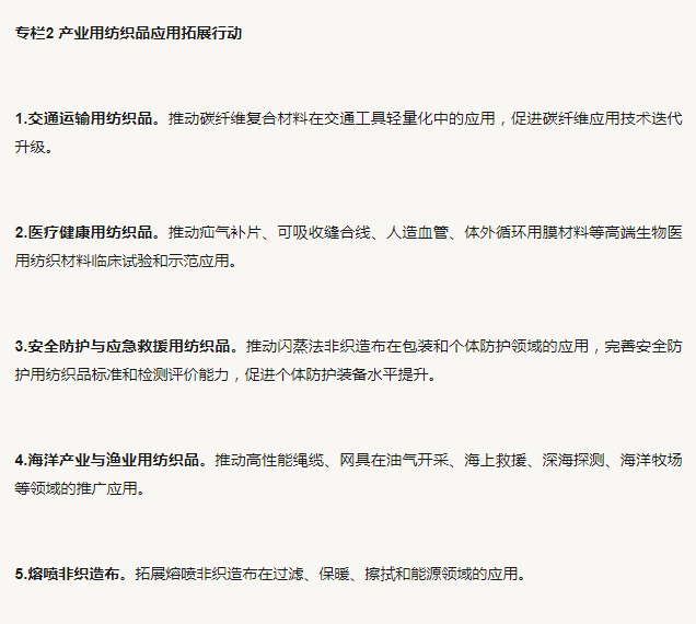 6.扩大产业用纺织品在国民经济各领域的应用。支持企业、行业协会等机构以国民经济各领域需求为导向,与有关方面加强交流合作,扩大产业用纺织品在航空航天、基础设施建设、环境保护、建筑、能源、国防军工等领域的应用。