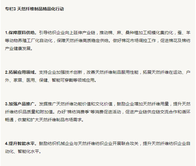 7.推动棉毛麻丝等天然纤维制品精品化高值化。支持行业协会、企业等机构整合农业、牧业、研发、制造、设计、营销等环节,推动棉纺、毛纺、麻纺、丝绸等行业构建三次产业融合发展新格局,增强创新驱动发展新动能,探索产业转型发展新模式,开创天然纤维产业发展新局面。