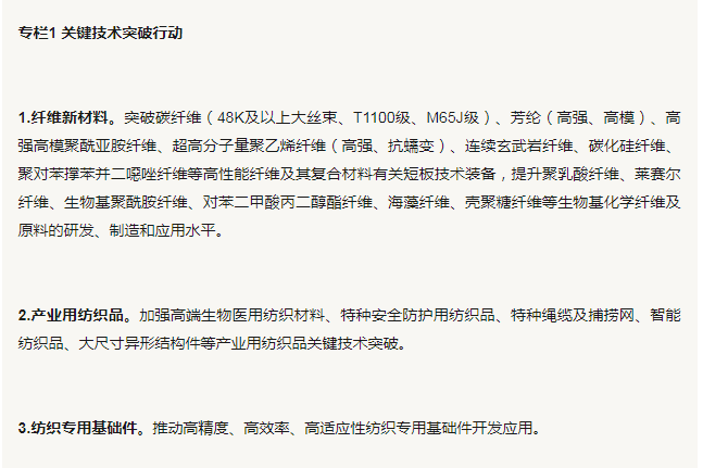 1.面向重大需求加强关键技术突破。鼓励企业围绕纤维新材料、功能性纺织品、智能制造装备等领域加快研发创新,形成一批原创性、引领性技术成果。