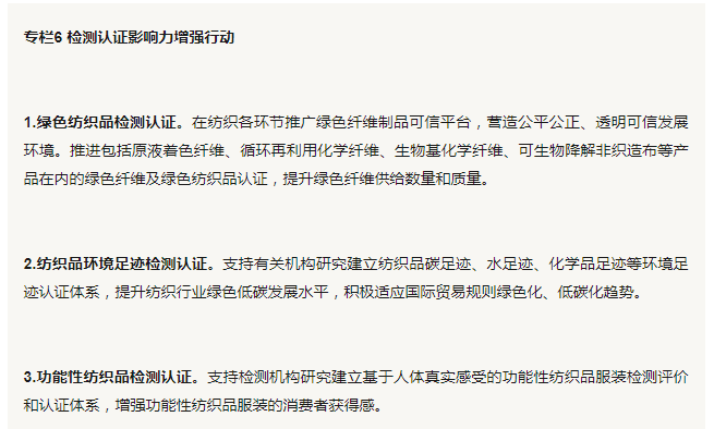 20.增强纺织品检测认证市场影响。支持开展纺织品检测认证服务,推进国内检测认证机构与国际有关机构加强交流合作和结果互认,提升纺织品的品质和功能性,丰富纺织品的内涵和价值。