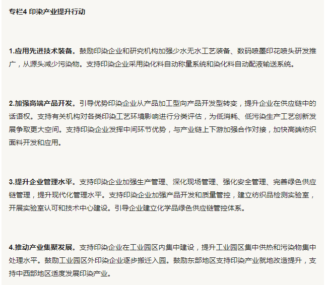 8.增强纺织产品印染加工环节的韧性和竞争力。优化印染行业发展环境,支持印染企业开展智能化绿色化改造,减少能耗水耗及污染物排放,强化纺织产业体系完整优势和产业链发展韧性。