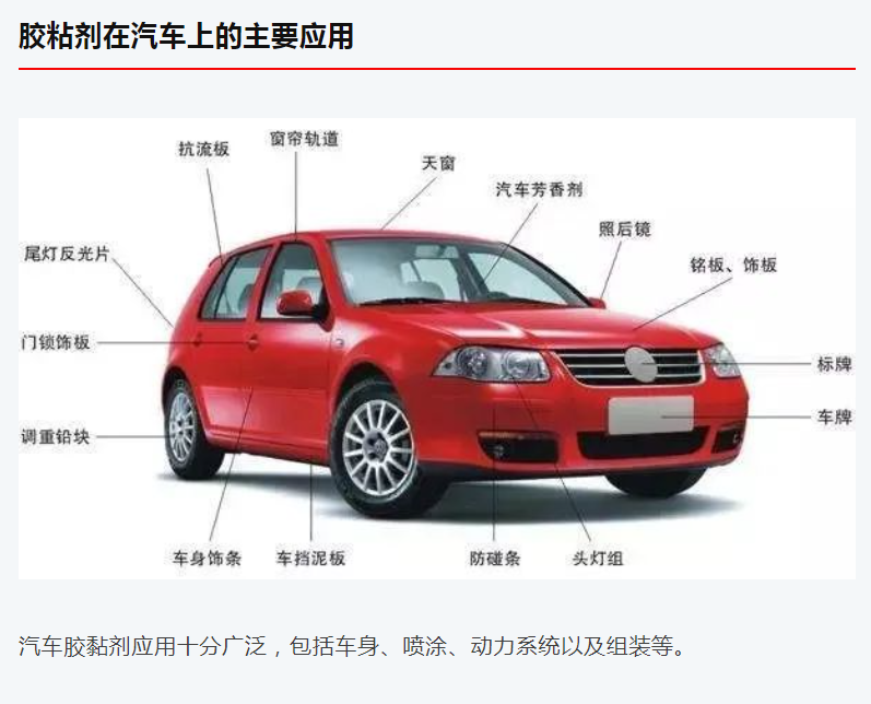 随着汽车制造技术的发展及其不断提高的性能要求,胶粘剂密封胶作为汽车生产所必需的一类重要辅助材料,应用越来越广泛。粘接技术在汽车制造上的应用,不仅可以起到增强汽车结构、紧固防锈、隔热减振和内外装饰的作用,还能够代替某些部件的焊接、铆接等传统工艺,实现相同或不同材料之间的连接,简化生产工序,优化产品结构。在汽车向轻量化、高速节能、延长寿命和提高性能方向发展的道路上,胶粘剂密封胶发挥着越来越重要的作用。
