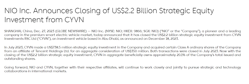 根据协议,CYVN将通过其附属公司CYVN Investments以现金形式向蔚来进行总计约22亿美元的战略投资,以每股股份7.50美元的购买价认购2.94亿股公司新发行A类普通股(“12月投资交易”)。