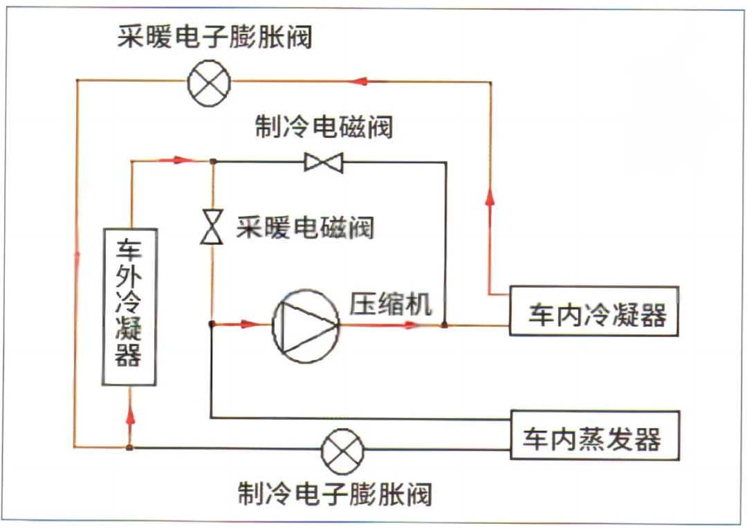 如图1所示,热泵空调系统主要包括电动压缩机、3个换热器(车外冷凝器、车内冷凝器及车内蒸发器)、2个电磁阀(制冷电磁阀及采暖电磁阀)、2个电子膨胀阀(制冷电子膨胀阀及采暖电子膨胀阀)以及制冷剂压力及温度传感器等。