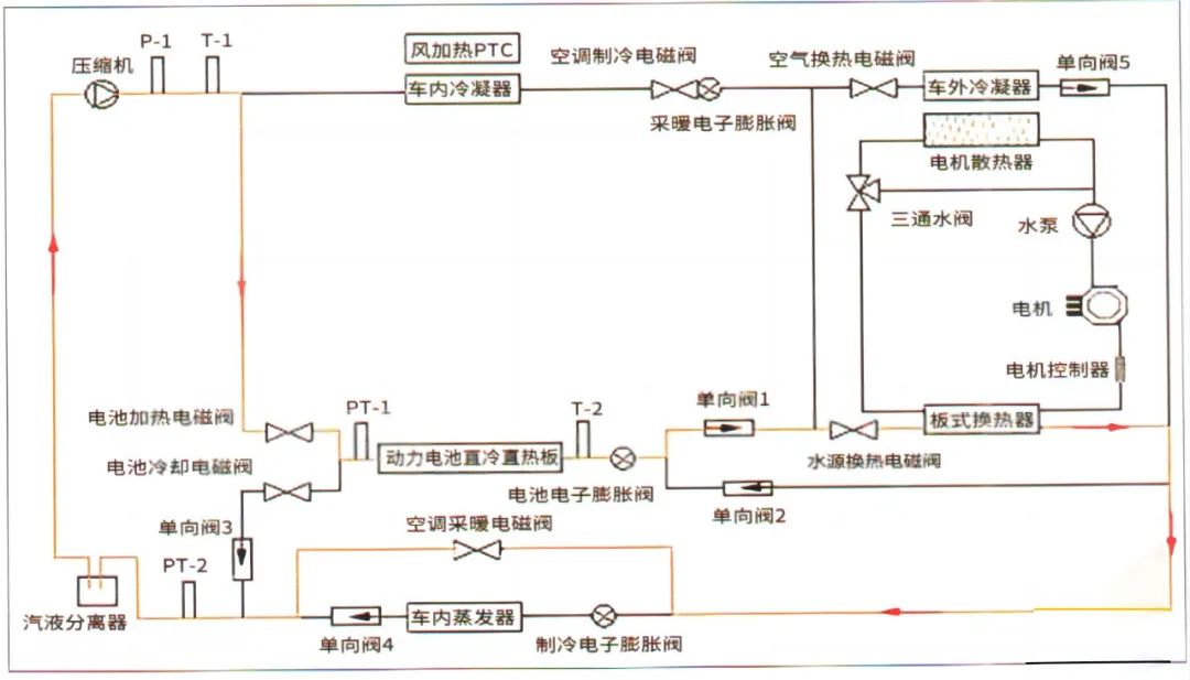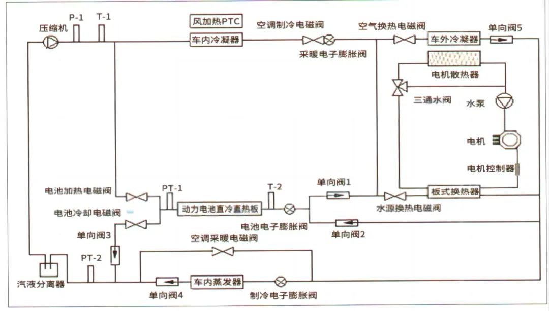 海豚车热泵空调系统原理示意图,如图6所示。图中PT-1、PT-2表示两个制冷剂压力及温度传感器,P-1,表示制冷剂压力传感器,T-1、T-2表示两个制冷剂温度传感器。