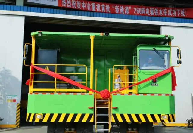“中冶重机”品牌“新能源”260吨电驱铁水车额定载重260吨,最大载重280吨,动力电池容量282千瓦时,行走总功率达到480千瓦,满载爬坡能力4%以上,每车每年可减少碳排放约34吨,适用于国内外各大冶金企业炼铁高炉至炼钢转炉间转驳运输1600摄氏度液态高温铁水。该产品集成了高效能电驱桥技术、ETCS多电机驱动控制技术、多系统能量管理及分配技术、电动和蓄能组合转向技术和电池安全管理技术等多项关键核心技术。