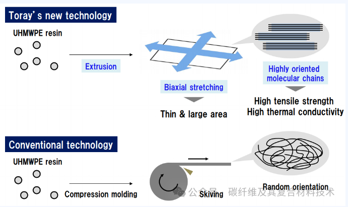 东丽利用其专有的挤出和双轴拉伸技术克服了上述难题,并创造了一种具有高度定向的超高分子量聚乙烯分子链的纳米结构。制备得到的薄膜几乎与不锈钢一样坚固,其拉伸强度是常用工业应用中聚对苯二甲酸乙二醇酯薄膜的两倍以上。它也和最坚韧的芳纶塑料薄膜一样坚固。