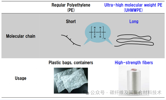 超高分子量聚乙烯(Ultra-high molecular weight polyethylene,UHMWPE)作为一种工程塑料,其分子量是普通聚乙烯的10倍。高强度纤维因其优异的强度而采用了这种材料。但它的缺点是加工性低,因为分子链很长并且高度纠缠,这使得生产具有双轴拉伸的高强度薄膜变得困难。
