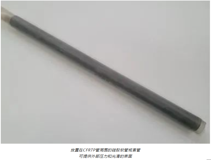在管的外部,使用硅胶软管或套管在 CFRTP 管的圆周周围产生压缩压力。为了实现压缩力,硅胶软管的内径比 CFRTP 管的外径小大约 25%,在管子加热过程中所施加的压缩力带来的一个积极的效果是外表面由于热塑性基体的熔化而变得光滑。