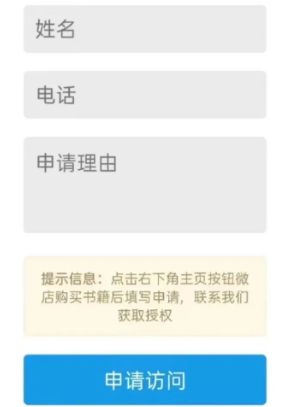 微店购买后,复制链接https://flbook.com.cn/c/N2uZE5AXGh发送到微信中,点击打开在线试读,试读结束后弹出申请授权窗口,申请理由填写微店订单号
