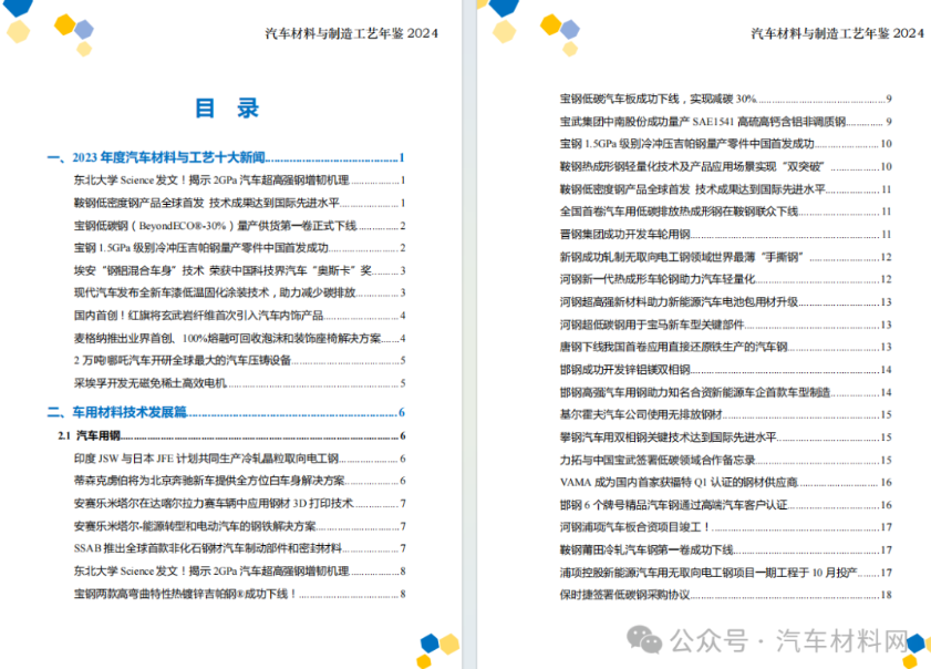 1)第一章为“2023年度汽车材料与工艺十大新闻”。主要记录通过过去一年汽车材料与工艺领域的热点新闻与重点技术进展。