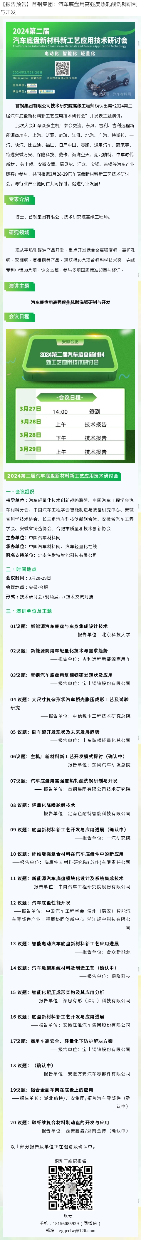 首钢集团有限公司技术研究院高级工程师确认出席“2024第二届汽车底盘新材料新工艺应用技术研讨会”并发表主题演讲。
