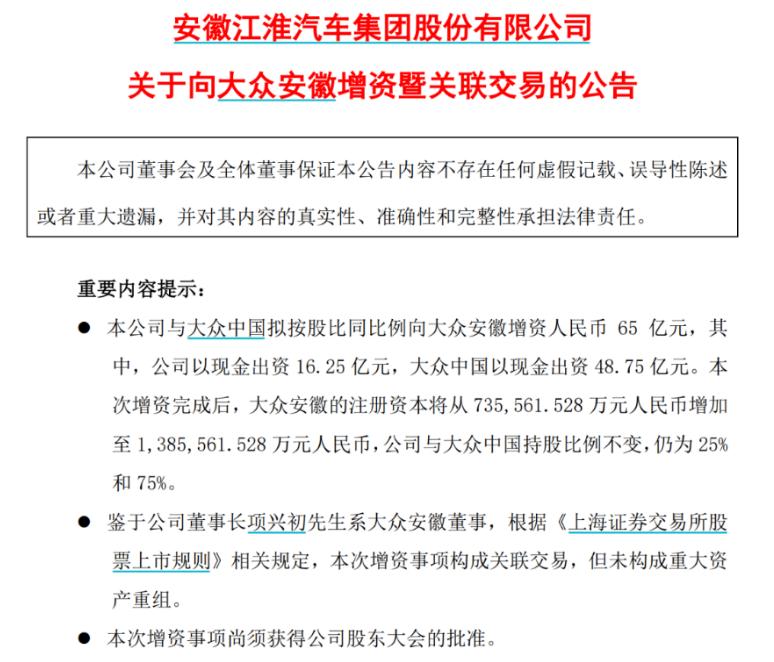 江淮汽车方面称,本次增资有利于进一步深化公司和大众中国的战略合作,助力大众安徽增强其综合实力及抗风险能力,符合公司股东利益。根据公告,此次增资出资期限为2024年至2025年,由江淮汽车与大众中国同步分批支付到位。都知道大众安徽是江淮汽车和大众中国成立的合资公司,但这背后更微妙的关系,是大众中国还是江淮汽车第一大股东江汽集团的股东之一。过去8年里,江淮和大众在一次次的联与接中,把彼此的故事写到了3.0版本。