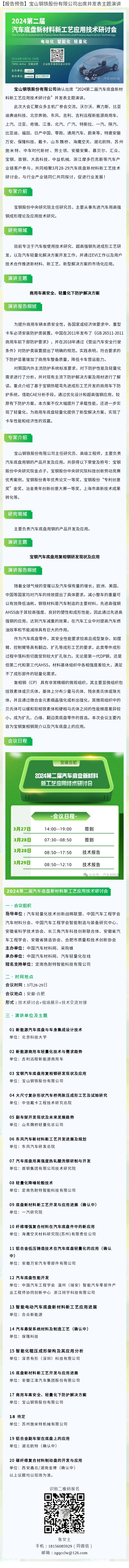 宝山钢铁股份有限公司确认出席“2024第二届汽车底盘新材料新工艺应用技术研讨会”并发表主题演讲。