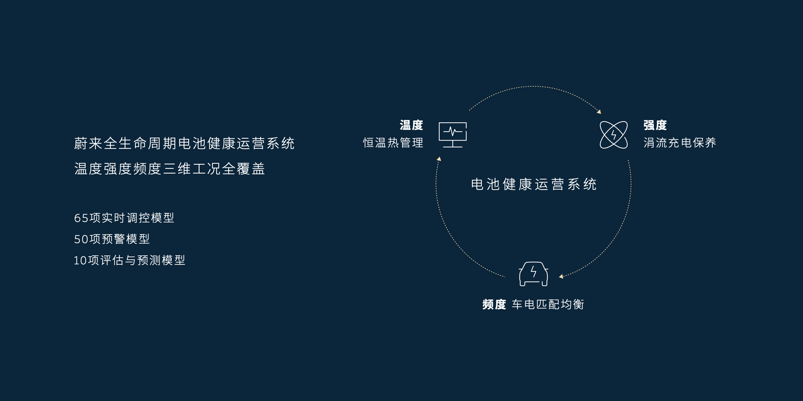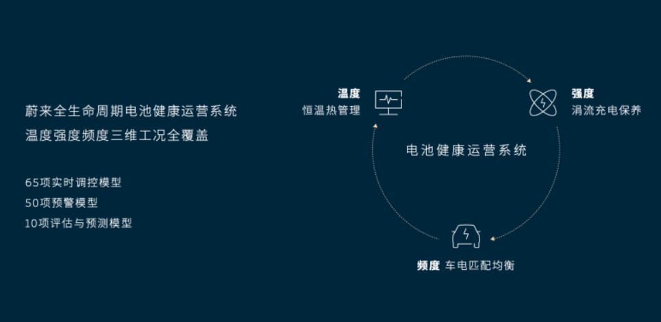 蔚来此前的实践已经证明,通过换电运营,降低日常恶劣工况的影响是提升动力电池寿命的有效途径。蔚来在行业内首个建立全生命周期电池健康运营系统 ,实现对温度、强度、频度三大影响电池寿命工况全覆盖,基于对动力电池大数据的运营和调度,进一步提升换电体系动力电池寿命。