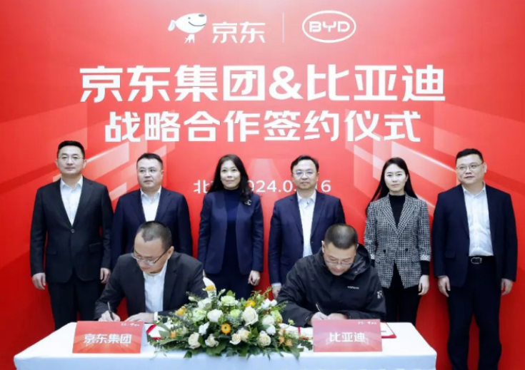 3月16日,京东集团与比亚迪战略合作协议签约仪式在北京京东总部举行。比亚迪董事长兼总裁王传福、京东集团CEO许冉出席仪式并见证签约,比亚迪采购处总经理王渤、京东集团执行副总裁王培暖分别代表双方签约。