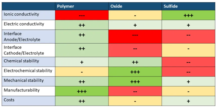 在汽车领域的固态电池应用中,可考虑使用三大类固态电解质:氧化物基、硫化物基和聚合物基电解质。下文将介绍这三类电解质的主要特性及其优缺点。下图显示了不同电解质的优缺点比较,“+”越多代表优势越明显;“-”越多则代表劣势越明显。