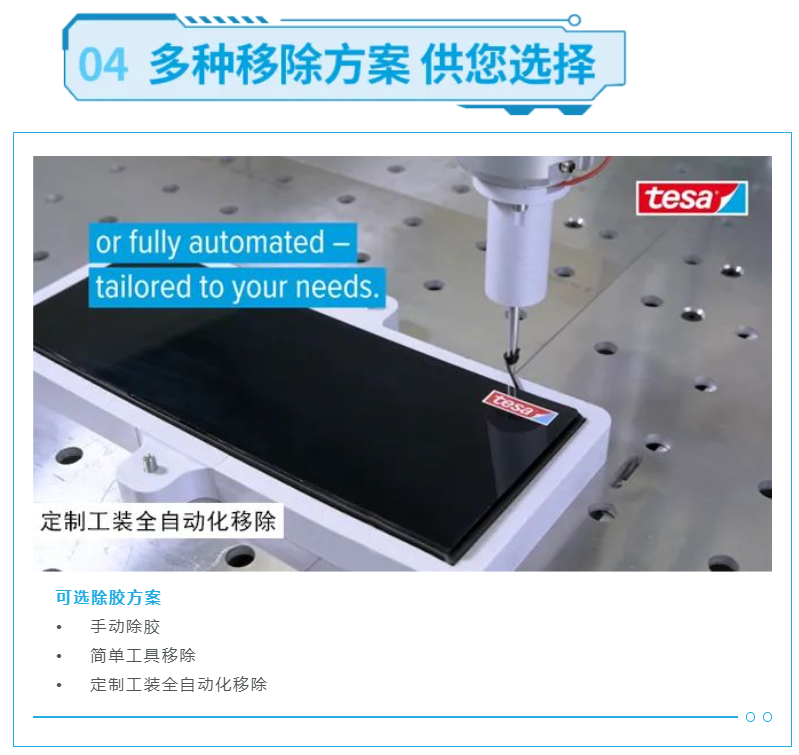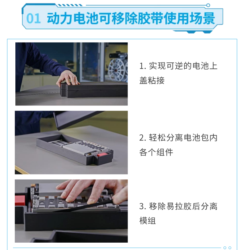 针对行业痛点,德莎胶带推出的动力电池可移除粘接解决方案tesa® 76565,在电池包的生产过程中具有可重工性,通过减少返工时间和材料的使用来减少废料、优化成本。此外,tesa® 76565还具有可维修和可回收性,可以在使用寿命结束后分离部分组件,实现了汽车动力电池作为高价值部件重复利用的可能性。