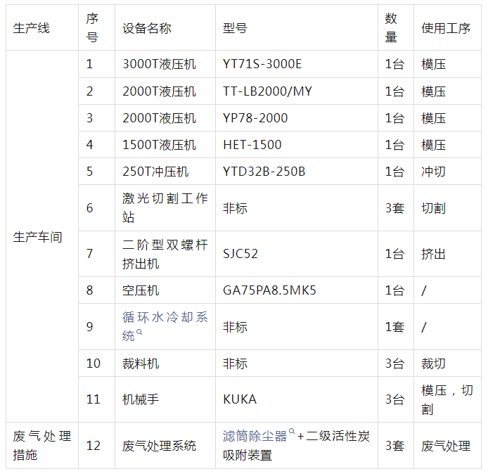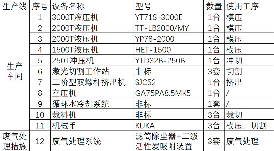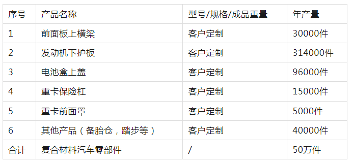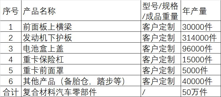 项目产品为复合材料汽车零部件,年产量为50万件,具体包括前面板上横梁、发动机下护板、电池盒上盖、重卡保险杠、重卡前面罩、其他产品备胎仓,踏步等,产品的主要成分为PP玻璃纤维材料,产品综合利用PP的可塑性及高强度机械性能和良好的高耐磨加工性能以及玻璃纤维材料的耐热性强、抗腐蚀性好、机械强度高等特点。