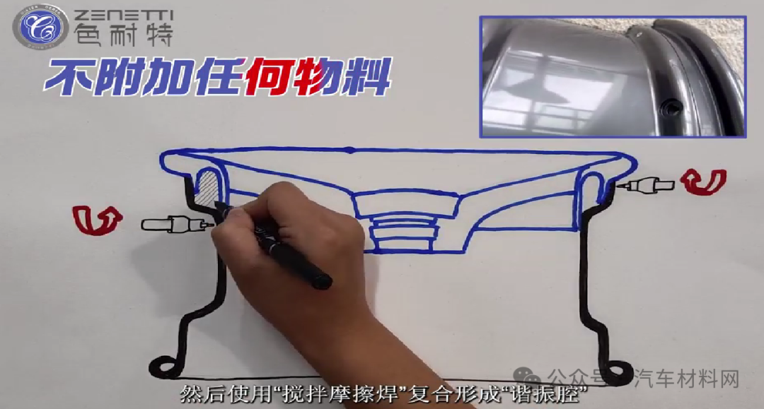张其峰:轮毂的“轻量化”与“高刚性”是一对矛盾性能指标。我们的轮毂技术创新不仅成功在保持高刚性的同时达到了超轻量化的目标,更在轮毂的“轮辋”与“轮辐”交界处,采用先进的搅拌摩擦焊复合技术,构建了“亥姆霍兹谐振腔”。这一创新设计巧妙地运用了内嵌声学结构原理,显著降低了胎腔噪音,为用户带来更为静谧的驾驶体验。