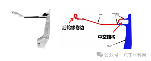 不同点:我们的“轮辋”是应用高强度6061铝合金板材通过“旋压+冲压”工艺成型,我们在轮毂的后轮边实施“卷边”结构,实现了大幅度提高“抗变形”能力的同时彻底解决了后轮缘“开裂”的问题。通过在轮辋和轮辐交界处“FSW”复合形成“亥姆霍兹谐振腔”,使得胎噪声波在轮毂内进行对冲抵消,实现大幅降低胎噪,无高昂成本增加,且无售后维修难等问题。同时,轮辋和轮辐交界处的空腔设计,也使得轮毂更加轻量化,节省原材料成本。