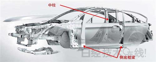 除了N BOX之外,本田在面向日本的其他本田车上也广泛采用了热冲压钢板。比如2012年11月上市的轻型汽车“N-ONE”和2013年6月21日上市的新款混合动力车“雅阁混合动力车”等。N-ONE的中柱加强件使用了热冲压钢板,雅阁混合动力车的中柱加强件和门槛梁的一部分采用了热冲压钢板,为减轻车重做出了贡献(图2)。