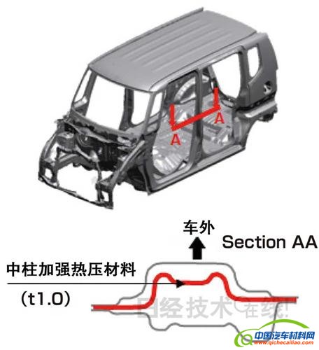 例如,本田用于N BOX中柱强化件的热冲压钢板在加工前的强度为590MPa左右,冲压成型时通过加热将其软化为与270MPa级钢板相当的强度,冲压成型后借助淬火效果,将强度提高到了1500MPa左右。