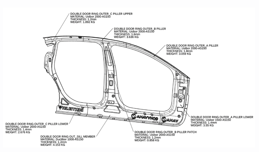 在外双门环的设计中,如上图所示,第二代铝硅镀层热成形钢Usibor®2000首次被应用于门环的B柱、C柱和车顶侧梁上部的外环上,其强度高达2000MPa,显著增强了这些关键部位在碰撞时的抗变形能力,为乘员舱提供了稳固的生存空间。同时,这种高强度材料还提升了车身的顶压性能,在车身翻滚、顶压等工况下,可以进一步保障驾乘人员的安全。