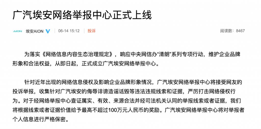 近日,网络上有消息称 " 广汽埃安将裁员 20%"、" 广汽埃安密集与应届生解约 "。针对以上不实信息,广汽埃安反应迅速,不但采取报案措施,而且还成立了广汽埃安网络举报中心。种种措施表明,广汽埃安要加大力度粉碎谣言,以正视听。