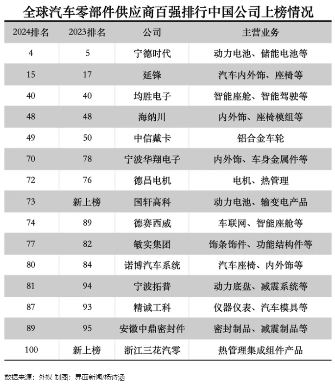 最新发布的2024年榜单中,共计15家中国企业上榜,较去年总数增长两家,创下历史最佳记录。尽管受到地缘政治动荡、电动汽车增速放缓等因素影响,中国本土零件供应商去年在全球市场的竞争力仍呈现稳步提升态势,上榜企业中无一排名倒退,多数公司有幅度不同的排名提升。