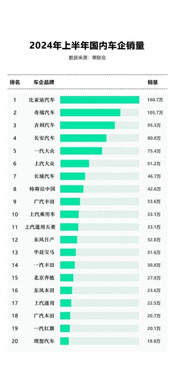 2024 年上半年国内车企销量排行榜出炉,中国新能源汽车表现出色,据乘联会数据显示,比亚迪凭借 160.7 万辆销量毫无悬念的位居榜首,比亚迪再次用销量成绩证明了它无愧于 " 中国的冠军,世界的冠军 " 的称号。