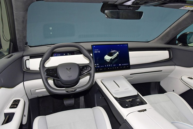 座舱部分,黑白撞色内饰看起来非常简约,整个中控台围绕悬浮大屏设计,除了方向盘外,其他单元基本都取消了物理按键,另外包括HUD抬头显示、手机无线充电、电子怀挡等功能也都不会缺席。