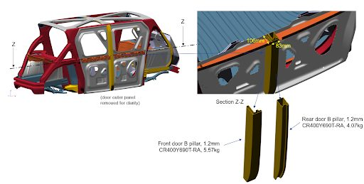 B 柱是主要结构构件之一,在发生高速侧面碰撞时保护车内乘员和动力电池。碰撞模拟表明,Steel E-Motive SEM1 车辆有可能获得 IIHS“良好”(最高)侧面碰撞评级,并且在发生碰撞时电池得到良好保护。Steel E-Motive B 柱位于前后侧盖的闭合边缘。在发生高速侧面碰撞时,B 柱截面轮廓可确保两个 B 柱变形、接触并结合,形成有效的箱形截面,以对侧面碰撞载荷作出反应,从而最大限度地减少侵入。