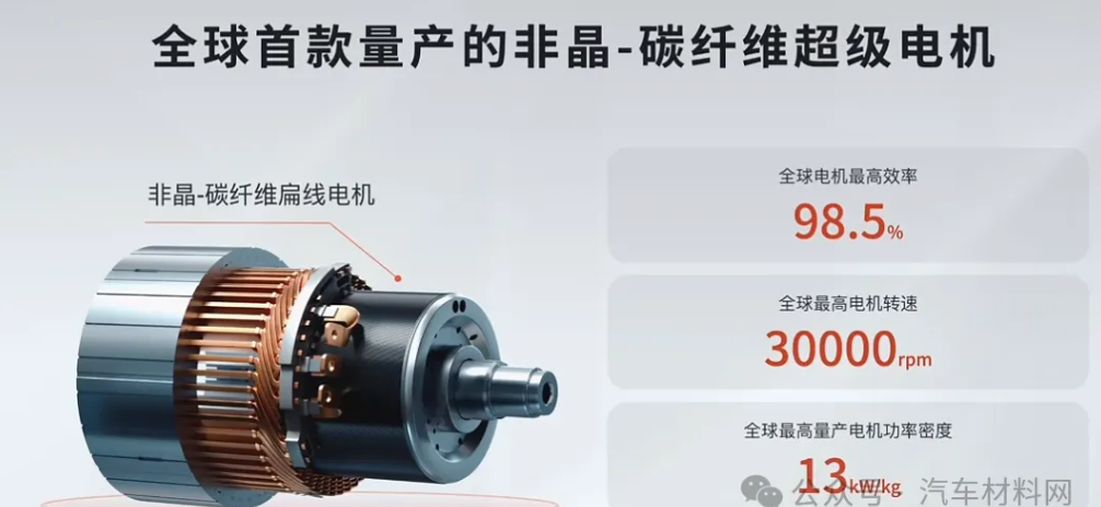 此次,全球首款量产的非晶-碳纤维超级电机正式发布。下线的电驱非晶电机性能优异,多项性能参数处于业界领先。