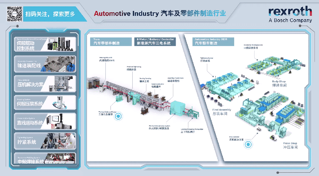 作为制造商的工业自动化全价值流生态伙伴,博世力士乐为新能源汽车厂商打造了触手可及的行业解决方案,全面覆盖整车制造、零部件制造、和新能源汽车三电系统等应用场景。用户不仅能借助我们的应用诀窍极速登陆风口快车道,还能利用我们的产品组合兑现成本优势。