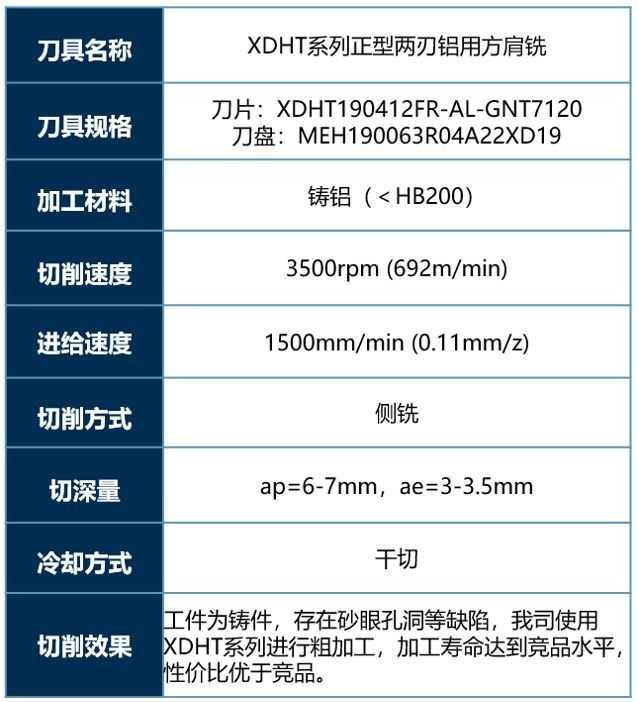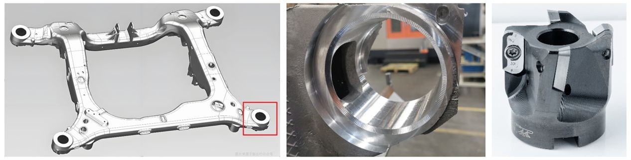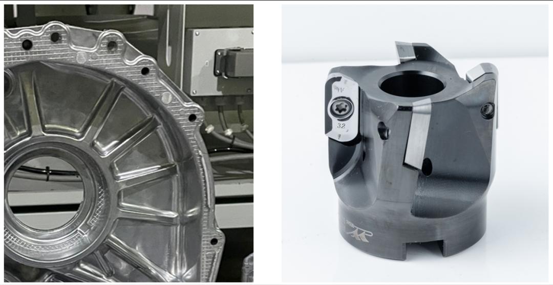 主要用于铝合金的粗加工和精加工,广泛运用于电机壳、减速器壳体、副车架、拉杆等汽车零部件中,同时也广泛运用在航空铝合金件加工中。其加工形式包含:方肩铣、面铣、槽铣、型腔铣;适合小切深、大切宽、高进给的加工,保证效率的同时加工表面质量优异。刀片刀尖圆角范围从R4到R50,刀盘直径范围从25mm到125mm,具备以下设计特点: