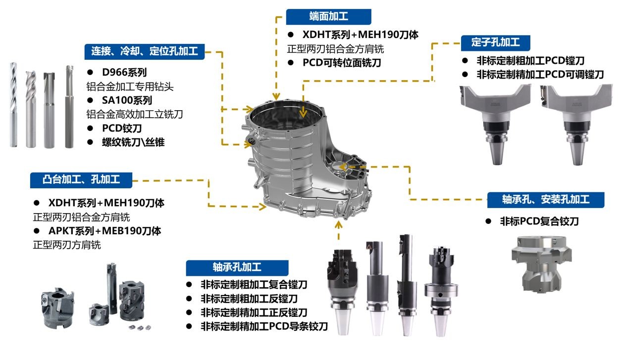 三合一电驱系统指的是将电控、电机和减速器集成在一起的电驱系统,主要包含驱动电机壳、减速器壳体、传动轴、齿轮等零部件。为了满足新能源汽车轻量化的需求,驱动电机壳和减速器壳体的材料为铝合金;而传动件为了获得足够的强度刚性,轴齿的材料一般为合金钢。电驱系统的加工涵盖车削、铣削、镗削、钻孔、铰孔、滚齿等多种加工形式,需要搭配高精度、高稳定性的刀具才能满足加工要求。