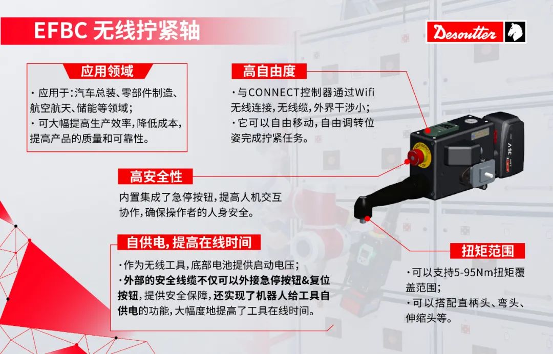 随着工业制造技术的高速发展,各行业生产车间的自动化、智能化程度越来越高;为了满足日益精进的工艺要求和高产能的生产节拍要求,不仅仅需要考量自动化设备的集成度,同时装配工具自身的精度、可靠性、装配效率也尤为关键。例如多用于总装和动力总成的MULTI多轴拧紧系统,以及广泛应用于三电行业的RAPID自动送钉系统,都是高精工具集成在自动化装配中典型且成熟的应用案例。以EFBC无线拧紧轴为例,探索不同的自动化集成方案应用。