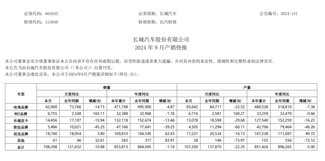 至于长城汽车,其已连续多月跌出榜单前十名。官方销量显示,9月长城汽车销量为10.84万辆,同比下滑10.88%,连续五个月销量同比下滑,旗下品牌哈弗、欧拉均出现下滑,分别同比下滑14.73%和45.25%。