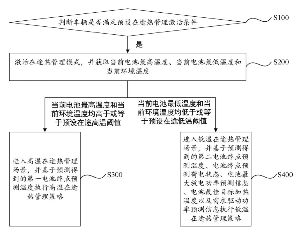 本发明可以在保证电池的热安全性和整车动力性的前提下,尽可能地避免电池热管理系统非必要的加热或冷却,降低电池热管理的能耗,提升整车的综合续航里程。