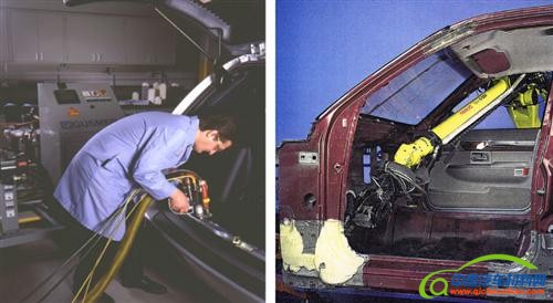 车身结构件注入发泡材料的过程 左:人工喷枪注塑 右:机器喷枪注塑