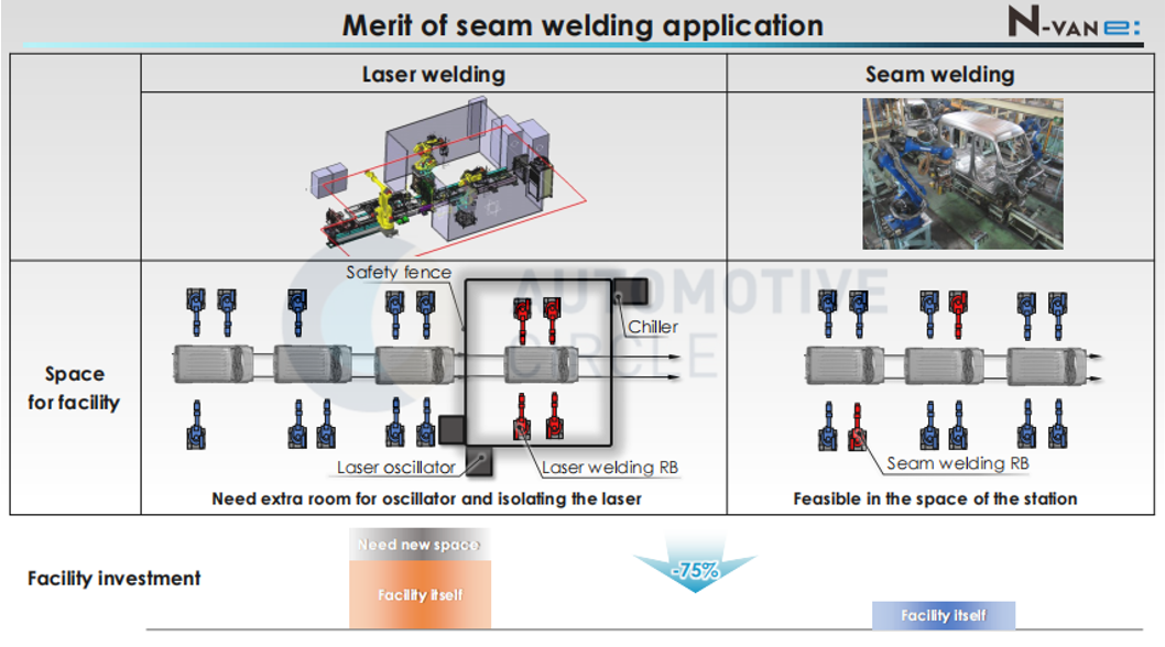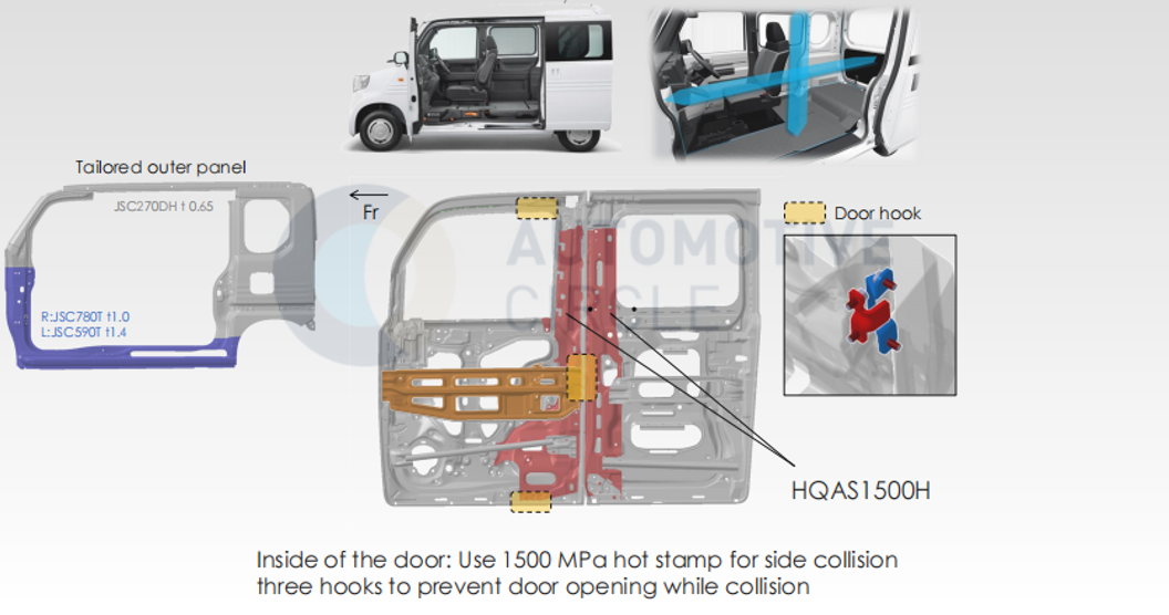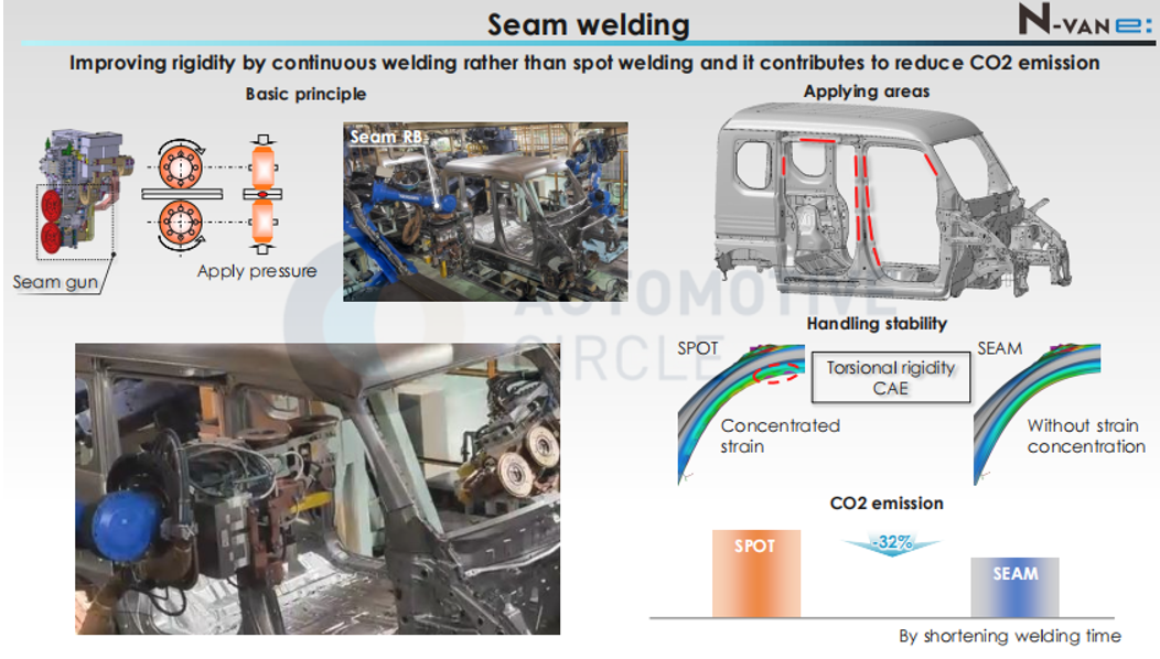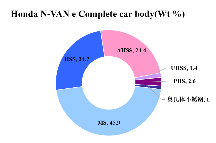 Honda N-VAN e车身主要以钢为主,主要连接方式为点焊、MAG焊、卷边及胶等。