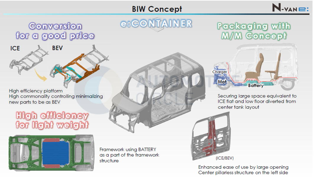 车身使用电池框架作为白车身的部分结构;平坦、低地板和高天花板实现的大型载货空间;通过取消中柱实现的乘客侧大开口。