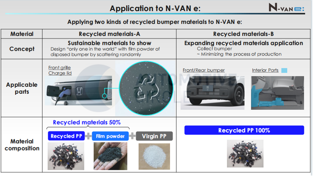 针对未来加强回收材料的应用,并将保险杠回收材料应用于N-VAN e车型的内外饰设计部件上。