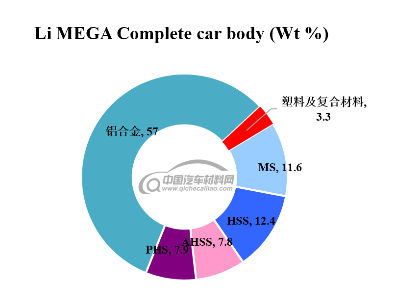 下图为Li MEGA的白车身用材情况,由图可知,Li MEGA的白车身主要采用钢、铝材料,其中传统软钢用量11.6%;高强度钢用量为12.4%;先进高强度钢用量为7.8%;热成形钢用量为7.9%;铝合金用量为57%;塑料及复合材料用量为3.3%。