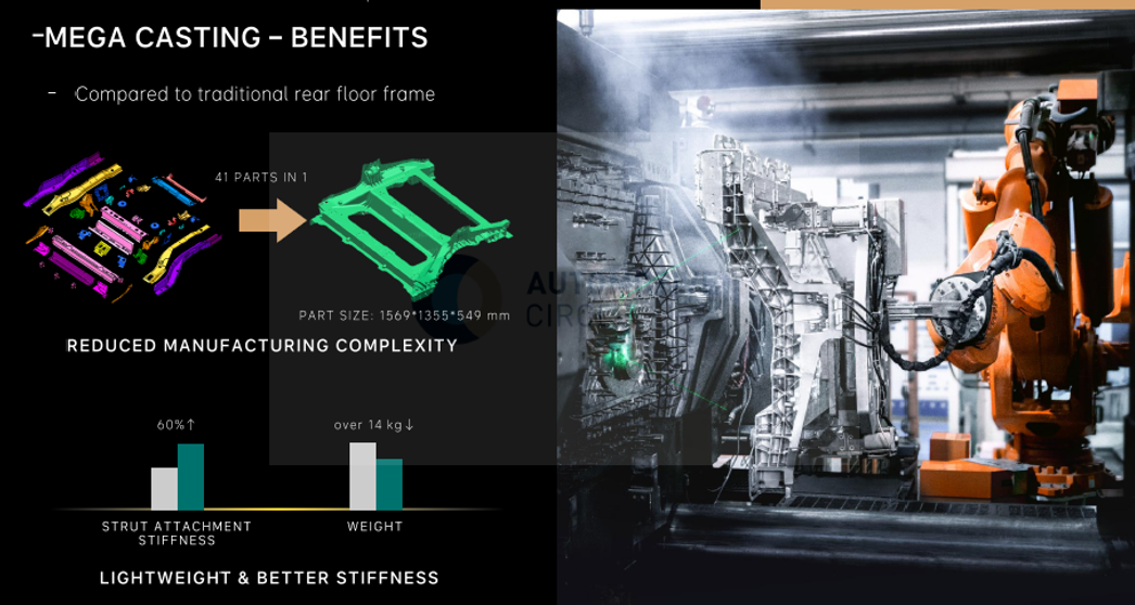 大型压铸采用其自研免热处理压铸铝合金材料LeFlow,更高的流动性,更高的强度/韧性。相比传统后车体件,采用大型压铸,将41个零件集成一个大型铸件,扭转刚度提升60%,重量减轻14kg。