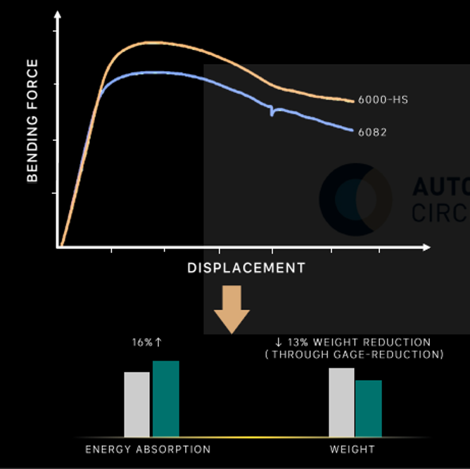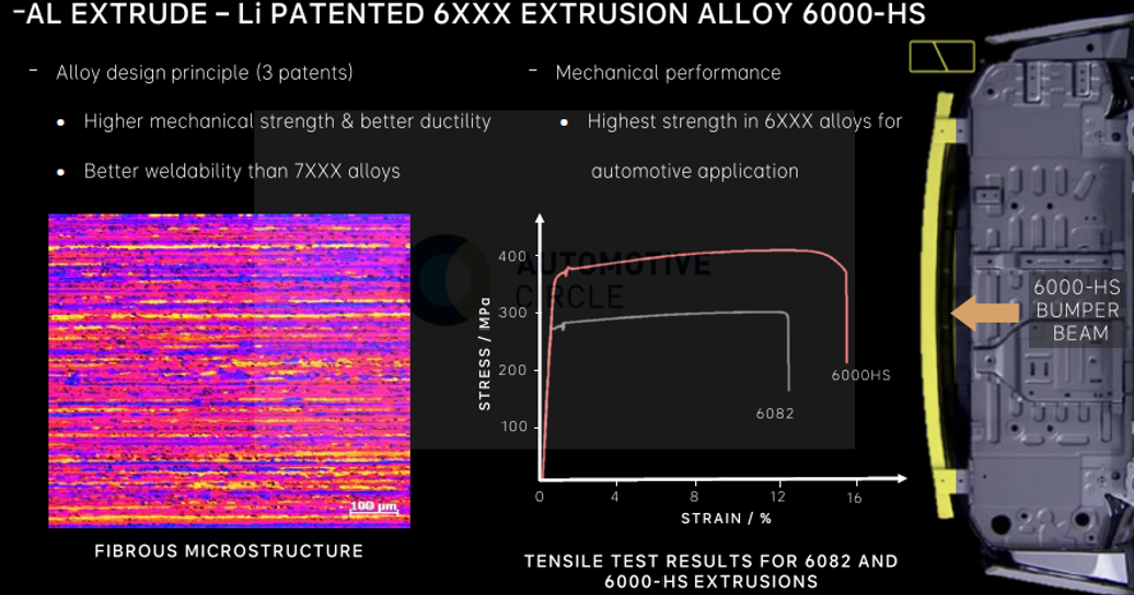 后防撞梁采用自研6000-HS高强铝型材,6000-HS铝型材的强度提高25%,其制备的防撞梁零件的最大弯曲抗力、碰撞吸能能力均提升了16%,减重13%。